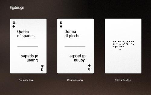 ![]() В креативном агентстве Flydesign придуманы игральные карты без дизайнаВ агентстве FlyDesign создали первые национальные игральные карты. Имея в историческом багаже водку и русскую рулетку, россияне получили и русские карты. На картах принципиально отсутствуют надоевшие всем примитивные изображения королей, куртизанок, пажей, страшных веселых джокеров и прочей азартной атрибутики. Играете ли вы в "дурака", "пьяницу", бридж, преферанс или просто раскладываете пасьянс, вы видите лаконичные надписи, тем самым доказывая факт, что Россия - самая читающая страна в мире. Колода оптимизирована для игры в полумраке, где, играя в обычные карты, легко перепутать масти и из-за нелепой ошибки быть обвиненным в шулерстве. В ближайшем будущем планируется производство карт на английском и итальянском языках, колоды для слепых (с использованием азбуки Брайля), а также карт для детей, надписи на которых выполнены увеличенным шрифтом и по слогам. Идея: Дмитрий Твердохлебов, Михаил Комиссаров Дизайн: Михаил Комиссаров Визуализация: Денис Ковалевский, Руслан Салехов Модель: Екатерина Миронова ![]() ![]() ![]() |