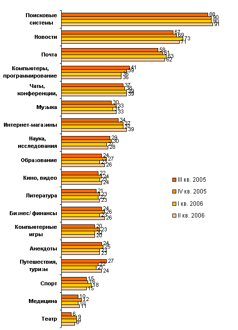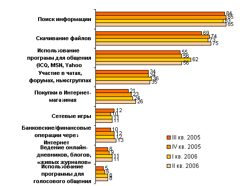 Интернетчики о видах деятельности в Сети и посещаемых сайтахВ рамках ежеквартального проекта «Мониторинг Интернета» исследовательский холдинг ROMIR Monitoring задал пользователям Рунета ряд вопросов об основных видах деятельности в Сети и о тематике посещаемых сайтов. Исследование проводилось в рамках онлайн-омнибуса, всего во 2 квартале 2006 года был опрошен 2641 пользователь старше 12 лет. Какими из этих видов деятельности в Интернете Вы занимались в течение последнего месяца? (%) Возможно несколько ответов ![]() Источник данных: онлайн-омнибус (12+), III кв. 2005, N = 3588, IV кв. 2005 N = 2802, I кв. 2006, N = 3351; I I кв. 2006, N = 2641. Согласно результатам исследования, в течение года практически не менялось соотношение между различными видами деятельности в Интернете. Наибольшая часть Интернет-аудитории по-прежнему занимается поиском информации (85%), скачиванием файлов (75%) и использованием программ для общения (56%). И доли пользователей, практикующих эти виды деятельности, вполне можно назвать устоявшимися. Вместе с тем по сравнению со вторым полугодием прошлого года в первом полугодии этого года наблюдается небольшой, но устойчивый рост количества пользователей, использующих программы для голосового общения, а также посещающих блог-системы и ведущих онлайн-дневники. Также из квартала в квартал растет доля посетителей интернет-магазинов. Недельная Интернет-аудитория, как правило, занимается только основными видами деятельности в Интернете: поиск информации и, в меньшей мере, скачивание файлов. Самые активные пользователи (дневная аудитория) занимаются в Интернете практически всеми рассматриваемыми видами деятельности. В II квартале 2006 г., как и при предыдущие периоды исследования, интересы пользователей-мужчин и пользователей-женщин несколько различаются. Так, например, мужчины несколько чаще, чем женщины, занимаются скачиванием файлов (78% против 70% соответственно), финансовыми операциями через Интернет (16% против 8%), сетевыми играми (13% против 7%) и программами для голосового общения (10% против6%). Тогда как женщины значимо больше, чем мужчины занимаются ведением онлайн-дневников и блогов (14% против 9% соответственно). Другие виды деятельности в Интернете привлекают как мужчин, так и женщин в примерно одинаковой степени. Если рассмотреть предпочтения по видам деятельности в Сети среди пользователей разных возрастов, то можно отметить, что интернетчики старших возрастных групп (от 35 лет) чаще, чем выборка в целом занимаются поиском информации. В наиболее молодых возрастных группах (14-24 года) значимо больший процент тех, кто использует Интернет для скачивания файлов, играет в сетевые игры, ведет «живые журналы», а также тех, кто участвует форумах, чатах и ньюсгруппах. Интернетчики 18-24 лет чаще, чем в целом по выборке, используют программы для общения (ICQ, MSN, Yahoo Messenger). А банковские/финансовые операции через Интернет и покупки в Интернет-магазинах чаще других совершают респонденты в возрасте от 35 до 44 лет. В рамках исследования интернет-пользователям было предложено рассказать о тематике наиболее часто посещаемых сайтов. Сайты какой тематики Вы посещали за последний месяц чаще всего? (%) Возможно несколько ответов ![]() Источник данных: онлайн-омнибус (12+), III кв. 2005, N = 3588; IV кв. 2005 N = 2802; I кв. 2006, N = 3351; I I кв. 2006, N = 2641. В целом на протяжении прошедшего года уровень интереса к сай