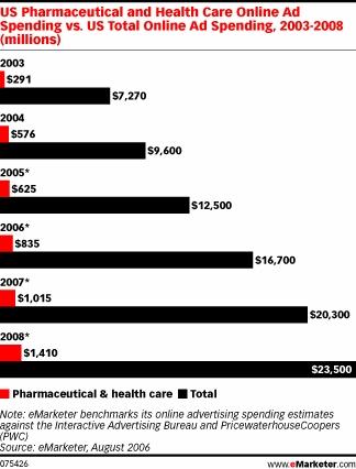 Согласно прогнозам аналитической компании eMarketer, в этом году расходы фармацевтических компаний на интернет-рекламу вырастут примерно на 25%, достигнув $780 млн. К 2008 году расходы на продвижение лекарств в Сети могут вырасти еще вдвое - до $1.3 млрд. Такие цифры приводятся в новом докладе «The Pharmaceuticals Online Report».