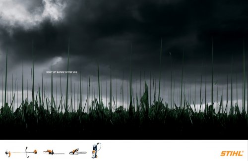 Реклама для Stihl от агентства Publicis Conseil"Не дай природе одолеть тебя". Так звучит слоган на новом постере, созданном агентством Publicis Conseil для Stihl - одного из крупнейших производителей бензопил и прочей техники. Основная идея заключается в том, что армия травы наступает, так что пора вооружаться. Агентство: Publicis Conseil, Paris, France Арт Директор: David Ariyel Творческий директор: Celine Lescure Фотограф: Jacques de Marcillac Ретуширование: DHX Production ![]() |