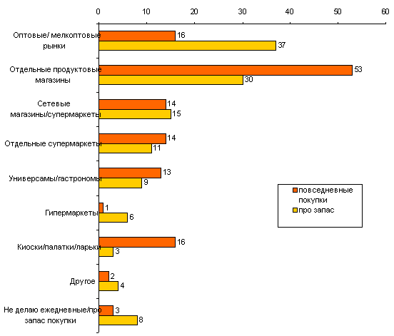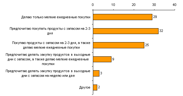 Стиль покупок: где и как россияне покупают продуктыВ рамках августовского всероссийского опроса исследовательский холдинг ROMIR Monitoring задал своим респондентам ряд вопросов на тему покупательских привычек и стиля покупок продуктов питания. Всего на национальной репрезентативной выборке было опрошено 1627 россиян старше 18 лет в более, чем 100 городах и населенных пунктах России. Статистическая погрешность не превышает ±2,5%. Прежде всего, участникам опроса были заданы вопросы о том, как часто и в каких объемах они закупают продукты. Как часто Вы ходите за продуктами? (%) ![]() Как выяснилось в результате исследования, свыше половины россиян (55%) совершают закупки продуктов практически каждый день, при этом почти половина из них (28%) делает это не реже 1 раза в день. Каждый пятый опрошенный (21%) делает покупки 2-3 раза в неделю. А практика закупки продуктов на неделю распространена среди десятой части (10%) жителей России. Стоит отметить, что закупка продуктов раз в неделю более характерна для жителей городов-миллионников (14%). Лишь 3% респондентов покупают продукты реже, чем раз в неделю. Каждый десятый россиянин (10%) признался, что не ходит за продуктами вообще. Закономерно, что частота совершения покупок зависит от пола респондента. Так, среди женщин доля посещающих магазин почти каждый день составляет 64% против 44% среди мужчин. И вместе с тем мужчины значительно чаще женщин говорили о том, что не ходят за покупками вообще - 18% против 5% соответственно. Респондентам, которые ходят за продуктами, был задан следующий вопрос: Как можно охарактеризовать объемы покупаемых Вами продуктов? (%) Ответы на него распределились следующим образом: ![]() Результаты исследования показали, что объемы закупаемых продуктов согласуются с частотой совершения покупок. Каждый третий опрошенный (32%) обычно совершает покупки с запасом на 2-3 дня. В основном такое покупательское поведение характерно для возрастной группы 45-59 лет, жителей малых городов с населением менее 100 тыс. чел. Немногим меньшая доля респондентов делают только мелкие ежедневные покупки (29%). Особенно часто это можно наблюдать среди молодежи 18-24 лет. Каждый четвертый россиянин (25%) покупает продукты с запасом на 2-3 дня, а также ежедневно докупает необходимое. Значительную долю среди них составляют женщины, респонденты 25-34 лет, покупающие, по всей видимости, продукты для всей семьи. Каждый десятый участник опроса (9%) ответил, что предпочитает делать разовую закупку продуктов на неделю или несколько недель вперед, приобретая затем разные мелочи по мере необходимости. В первую очередь это является обычной практикой для жителей городов-миллионников. И только 3% респондентов признались, что практикуют воскресный шоппинг за продуктами, который в течение недели и более им позволяет не задумываться о содержимом холодильника – продуктов хватает. Участникам опроса, которые ходят за продуктами, были также заданы вопросы относительно предпочитаемых мест совершения покупки продуктов и факторов такого выбора. В каких местах Вы предпочитаете делать повседневные покупки/про запас? (%) Ответы на него распределились следующим образом: ![]() Как показали результаты опроса, в зависимости от цели и объемов покупок потребители выбирают разные типы торговых точек. Так, например, повседневные покупки большинство опрошенных (53%)