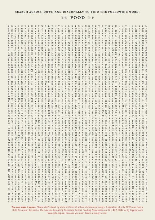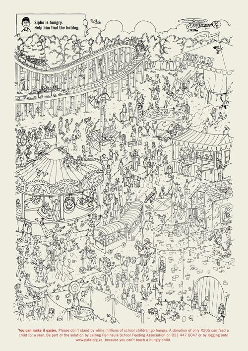 Агентство FCB для Школьной ассоциации питания Пиренейского полуостроваАгентство FCB разработало серию рекламных плакатов для Школьной Ассоциации Питания Пиренейского полуострова. Суть состоит в том, что детям Пиренейского полуострова также сложно найти еду, как Вам сложно найти упоминание о ней на плакате. Надпись: "Сифо голоден. Помоги ему найти хотдог / Найди по горизонтали, вертикали или диагонали следующее слово: Еда. Вы можете сделать это проще. Пожалуйста, не стойте в стороне, когда миллионы школьников голодны. Ваше пожертвование в размере всего лишь R205 может прокормить ребенка в течение года. Помогите решить проблему и позвоните в Школьную ассоциацию питания Пиренейского полуострова или зарегистрируйтесь на сайте, потому что трудно обучать голодных детей". Агентство: FCB, Cape Town, South Africa Творческий директор: Francois de Villiers, Schalk Van der Merwe Арт директор: Ross Nieuwenhuizen, Brenton Bubb Копирайтер: Fezile Marubalela, Dylan Kidson Иллюстратор: Wesley Lewis ![]() ![]() |
