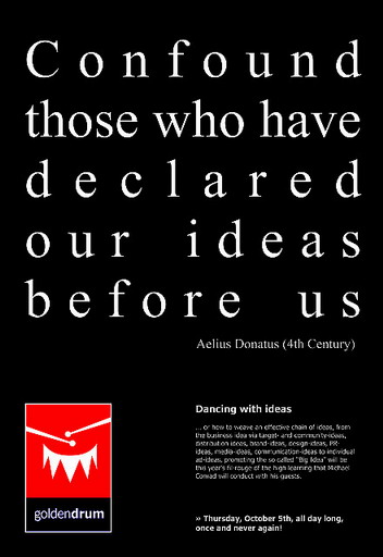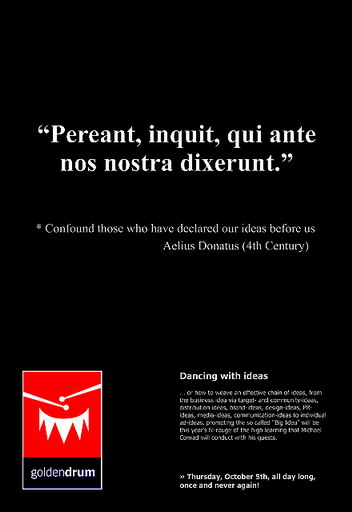 Конкурс плакатов Dancing with Ideas: определены финалистыВ рамках предстоящего 13-го международного фестиваля рекламы Golden Drum проходил открытый конкурс плакатов под девизом Dancing with Ideas. У конкурса не было специального брифа, авторам предоставлялась полная свобода по-своему трактовать и визуализировать название креативного семинара "Танцы с идеями", который пройдет на фестивале 5 октября под руководством Майкла Конрада. Как стало известно Sostav.ru, на конкурс поступило 139 работ, в том числе из России. Все работы представлены сейчас на официальном сайте www.goldendrum.com Жюри отобрало 12 финалистов и определило лауреатов, но их имена пока держатся в тайне и будут объявлены 2 октября в Портороже. Автор лучшего плаката получит чек на 5 тысяч евро и приглашение на фестиваль, обладатели второго и третьего места будут приглашены на "Золотой барабан" за счет организаторов. Одновременно с Dancing with Ideas проходил конкурс плакатов, посвященный рекламе словенского курорта Порторож и вновь открытого после долгой реставрации отеля Палас. Работы, поступившие на этот конкурс, будут представлены на Sostav.ru в ближайшее время. Ниже представлены все работы российских и украинских креаторов в рамках конкурса "Dancing With Ideas" ![]() Алексей Михайлов, Россия, "Dancing Men" ![]() Алексей Кондаков, Россия, "Dancing With Ideas" ![]() Adell Украина, Василь Хомко и Галина Спивак, "Srabble" ![]() Adell Украина, Василь Хомко и Галина Спивак, "Crash!" ![]() Adell Украина, Василь Хомко и Галина Спивак, "Bang!" ![]() Adell Украина, Василь Хомко и Галина Спивак, "Cha-cha-cha" ![]() Creative Lab "Creon", Россия, Кирилл Мясищев, "Dancing With Ideas" ![]() Creative Lab "Creon", Россия, Кирилл Мясищев, "Dancing With Ideas" ![]() Creative Lab "Creon", Россия, Кирилл Мясищев, "Dancing With Ideas" ![]() Creative Lab "Creon", Россия, Кирилл Мясищев, "Dancing With Ideas" ![]() Олег Юрчишин, Украина, "Geometry" ![]() Максим Кипра, Владислав Васюхин, Россия, "Burn or Die" ![]() AddValue, Украина, Андрей Копоц, "Our Ideas" ![]() AddValue, Украина, Андрей Копоц, "Our Ideas" ![]() MFIVE Creative Group, Россия, "To see" ![]() MFIVE Creative Group, Россия, "To Take to Heart" ![]() MFIVE Creative Group, Россия, "To Let Go" ![]() MFIVE Creative Group, Россия, "Not to Be Afraid to Start" ![]() Константин Петровский, Украина, "Parquet" ![]() Алексей Михайлов, Россия, "Chaplin" ![]() Алексей Михайлов, Россия, "Thinker" ![]() Олег Юрчишин, Украина, "Moth" ![]() Grey Moscow, Россия, Екатерина Чернопазова, Анна Образцова, "Watches" ![]() Grey Moscow, Россия, Екатерина Чернопазова, Анна Образцова, "Striptease" ![]() Grey Moscow, Россия, Екатерина Чернопазова, Анна Образцова, " Plug" ![]() Fastway, Россия, "Ideas That Torque!" ![]() Fastway, Россия, "Ideas That Rock!" ![]() FRESH, Россия, Дмитрий Павлов и Светлана Бакунова, "The Instant" ![]() Realpro, Россия, Владимир Черепанов, "Dance, Dance, Dance" ![]() Realpro, Россия, Владимир Черепанов, "Dancing With Ideas" ![]() Александр Храповицкий, Украина, "Inspire The Dance" ![]() Александр Храповицкий, Украина, "Inspire The Dance" ![]() Анна Третьяк, Гриша Коваль, Украина, "Mao" ![]() Анна Третьяк, Гриша Коваль, Украина, "Fidel USA" ![]() Анна Третьяк, Гриша Коваль, Украина, "Merilyn & Jackelin" ![]() GANKA, Украина, Анна Третьяк, Гриша Коваль, "Wheelchair" ![]() GANKA, Украина, Анна Третьяк, Гриша Коваль, "Jail" |
