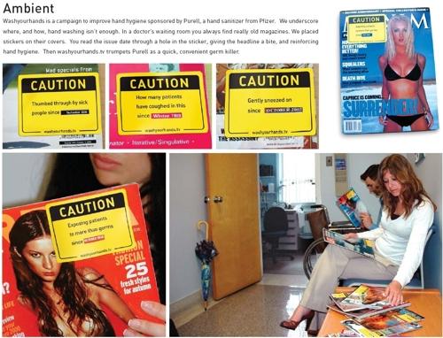 Партизанская реклама средства для очищения рук Purell агентства JWTЧтобы прорекламировать последнее достижение Purell, средства для очищения рук от Pfizer, агентство JWT разработало партизанскую кампанию. Она заключается в помещении информационных стикеров на обложки журналов, лежащих в приемных врачей, со следующими надписями: "Просматривалось больными людьми с октября 2005" "На это аккуратно чихали с октября 2002" "Как много людей кашляли в это с зимы 1989" Агентство: JWT Toronto ![]() ![]() |
