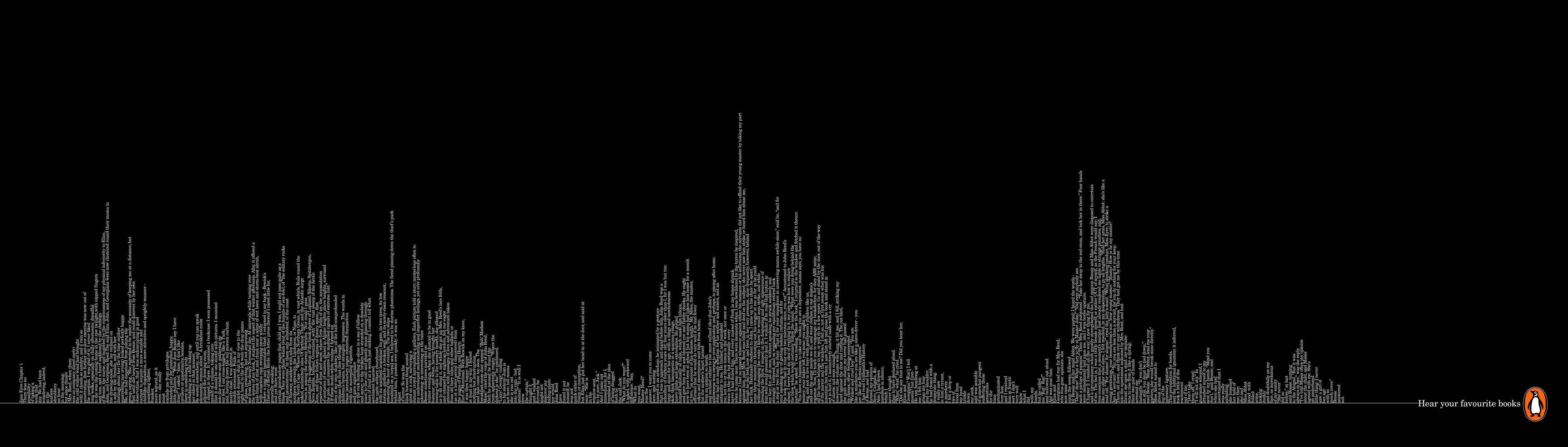 Рекламная кампания аудиокниг Penguin от агентства Y&RМалазийское агентство Y&R разработало рекламную кампанию для аудиокниг Penguin ("Пингвин"). Идея базируется на стилизации куска текста из популярных книг под изображения звуковых волн. На первом плакате в качестве звуковой волны выступает начало книги Эмили Бронте "Грозовой перевал", на втором - начало книги Шарлоты Бронте "Джен Эйр". Слоган: "…Слушайте Ваши любимые книги". Агентство: Y&R, Malaysia Творческий директор: Edward Ong Арт директор: Heng Yik See / Jeff Ooi Копирайтер: Ida Rahman Типография: Heng Yik See |
