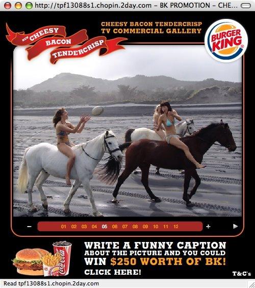 Рекламный ролик Burger KingЭта реклама была создана, чтобы подчеркнуть достоинства Burger King. Она утверждает, что регби, пляжи, лошади и девушки в бикини лучше вместе так же, как и сыр, бекон, курица и барбекю соус хороши вместе в сэндвиче Cheesy Bacon Tendercrisp. ![]() |