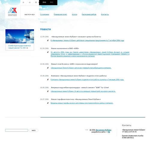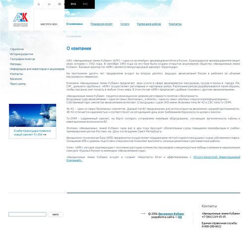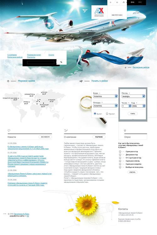 Студия XQ создала веб-сайт для "Авиационных линий Кубани"Студия XQ недавно закончила разработку сайта ОАО "Авиационные линии Кубани" . Основная концепция дизайна заключалась в том, чтобы выделить три идейные составляющие - небо, самолет и фирменный стиль авиакомпании. Что и было воплощено в жизнь. Летящий самолет "АЛК" над облаками, глубокое синее небо с голубем, предвещающим удачу, и, конечно же, солнечный подсолнух - плод жарких краснодарских полей, который также является символом "АЛК". Все это дополняется белой, синей и красной лентами, символизирующими атрибутику Российской Федерации. На сайте не только подробно представлена информация о самой компании и ее деятельности, но и есть фрагмент карты континентов с обозначением реального времени в городах, а также форма поиска для получения подробной информации о ближайших рейсах. ![]() ![]() ![]() ![]() ![]() |