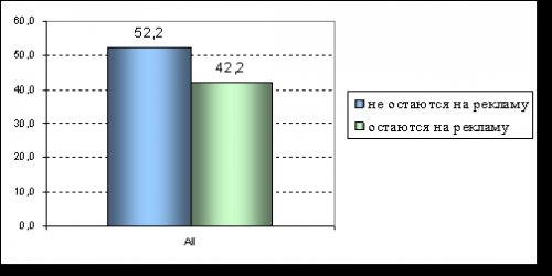 ТВ-реклама глазами жителей Санкт-ПетербургаОсновой оценки поведения петербуржцев во время трансляции рекламы по телевидению послужили данные исследования TGI-Russia, проводимого компанией КОМКОН. Согласно результатам исследования, во время выхода рекламных блоков телевизионная аудитория делится приблизительно поровну на тех, кто остается на выбранном телеканале (42,2%), и на тех, кто намеренно старается избежать непосредственного контакта с рекламой (52,2%).