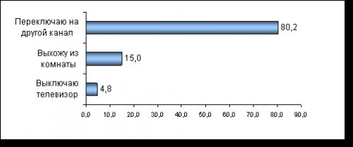 Источник: КОМКОН, TGI-Russia, 2006-I полугодие, население Санкт-Петербурга, 10+, % Если более подробно рассмотреть обе группы, то оказывается, что среди тех, кто остается во время трансляции рекламных роликов на выбранном телеканале, большинство (76,8%) все равно отвлекается на другие дела, и только оставшийся процент аудитории (23,2%) продолжает смотреть рекламу, иногда, однако, убавляя или отключая звук. Те же, кто избегают даже косвенного контакта с рекламой, исходя из данных опроса, поступают по-разному: 80,2% переключают телеканал, 15% покидают помещение, 4,8% вообще выключают телевизор.