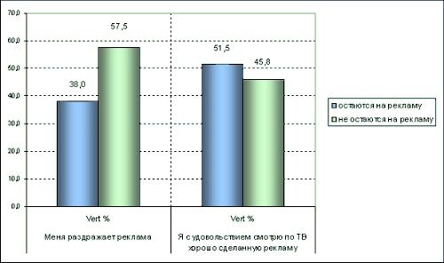 Источник: КОМКОН, TGI-Russia, 2006-I полугодие, население Санкт-Петербурга, 10+, % Значимых отличий в поведении различных возрастных групп телеаудитории во время трансляции рекламы на сегодняшний день не наблюдается. Самыми распространенными ответами на основной вопрос исследования, независимо от возраста, являются «переключаю на другой канал» (приблизительно половина респондентов) и «отвлекаюсь на другие дела, но не переключаю канал» (около трети опрошенных). Интересно также отметить, что даже те петербуржцы, кого, по их мнению, раздражает реклама, остаются на выбранном канале на время ее трансляции (38%). Между тем, среди тех, кто говорит, что с удовольствием смотрит хорошо сделанную рекламу, почти половина (45,8%) респондентов в повседневной жизни отказываются от ее просмотра.