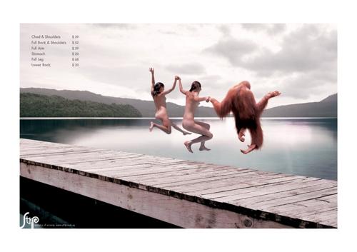 Реклама эпиляции от агентства Batey и студии StripОбычно для рекламы бритвенных принадлежностей или эпиляции используются сексуальные девушки с гладкими ногами и большой грудью. Агентство Batey решило пойти по другому пути. Они использовали обезьяну… Это весьма удачная и интересная реклама студии по удалению волос Strip. Слоган: "Strip - министерство эпиляции" Название: Озеро Клиент: Strip Waxing Studio Страна: Сингапур Агентство: Batey Творческий директор: Pablo Monzon Арт директор: Mark Bamfield Копирайтер: Ross Fowler ![]() |