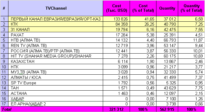 Как в 2005, так и в 2006 году лидер по рекламному бюджету - телекомпания 1 канал ЕВРАЗИЯ. За январь-сентябрь 2006 года рекламодатели потратили на размещение своей рекламы в эфире 1 канала ЕВРАЗИЯ - 133,8 млн. USD, что на 41,2% больше, чем за аналогичный период 2005 года. Всего в телеэфире 1 канала ЕВРАЗИЯ с января по сентябрь можно было увидеть 37,01 тыс. рекламных роликов - 6,58% от их общего числа. По количеству размещения роликов - канал на 9 месте.