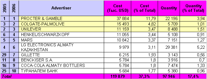 ТОР 10 рекламодателей за период январь-сентябрь 2005 и 2006 года, возглавляют компании: Procter&Gamble, Colgate - Palmolive, Unilever. Рекламный бюджет тройки лидеров составил 64,5 млн. USD - 20,1% от общего объема.