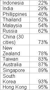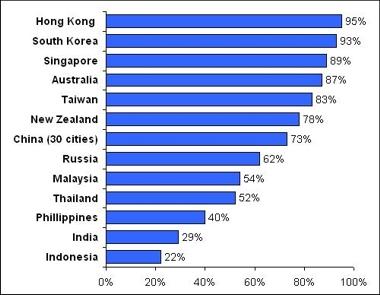 Глобальная "мобилизация". Обзор рынков мобильной связи азиатско-тихоокеанского региона и России по данным TGI Global 2006Проникновение мобильной связи в Гонк-Конге почти достигло полного насыщеия (95%). Южная Корея (93%), Сингапур (89%) и Австралия (87%) отстают от лидера всего на несколько пунктов. Высокая степень проникновения мобильных телефонов в этом регионе сопоставима с Великобританией (92%). В США, напротив, она составляет (71%) и отстает от Китая (73%). В России мобильным телефоном владеет 62% населения, согласно данным TGI-Russia. Москве этот показатель составляет 77%. По данным TGI-Premier, 93.5% москвичей, представителей среднего класса, владеют мобильным телефоном. На проникновение мобильной связи влияют экономические факторы, размеры населения страны и, естественно, доступность мобильных телефонов. Практически все рынки демонстрируют большой потенциал роста.