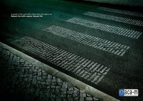 Зебра ACA-M от агентства FCBПеред Вами партизанская рекламная кампания ассоциации ACA-M (Associacao de Cidadaos Auto-Mobilizados), которая пытается остановить "цивилизованную войну", происходящую на дорогах Португалии и защитить своих граждан. Пешеходный переход "зебра" составлен из имен людей, сбитых на дороге. Надпись: "Четверть жертв дорожного движения - не внутри машины. Уважайте дорожные знаки. Уважайте жизнь". Агентство: FCB, Portugal. ![]() |