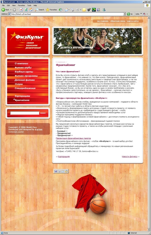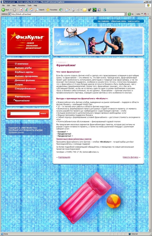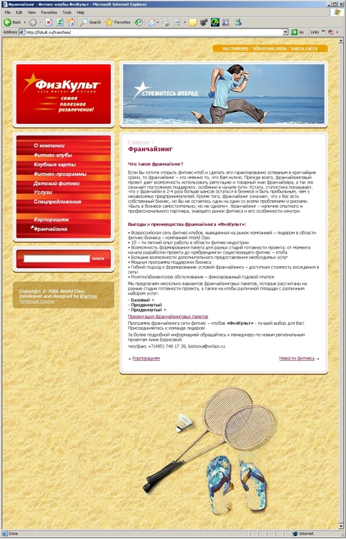 Интернет-компания iPartner завершила работы по созданию сайта для российской сети фитнес-клубов "Физкульт""Физкульт" - новая сеть фитнес-клубов, ориентированных на массового потребителя - проект российской премиум фитнес-сети World Class. До конца этого года в России запланировано открытие 8 клубов "Физкульт", из них 2 клуба в Москве. В ближайшем будущем планируется открытие клубов во всех регионах России. "Физкульт - самое полезное развлечение!" - главный девиз проекта стал основой творческого решения представленного сайта. 26 сентября фитнес-проект "Физкульт" представил официальный сайт сети. На сайте представлена полная информация о всех клубах сети, в т.ч. тех, открытие которых запланировано в будущем. Интерактивная карта дает возможность найти ближайший к дому или офису клуб во всех регионах России. Кроме того, на сайте представлена информация для потенциальных партнеров нового фитнес-проекта. "Физкульт" в скором планирует стать крупнейшим федеральным фитнес-брендом и сайт, созданный iPartner, призван ускорить этот процесс. ![]() ![]() ![]() ![]() |