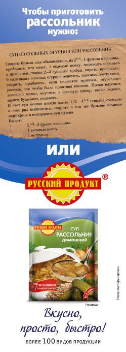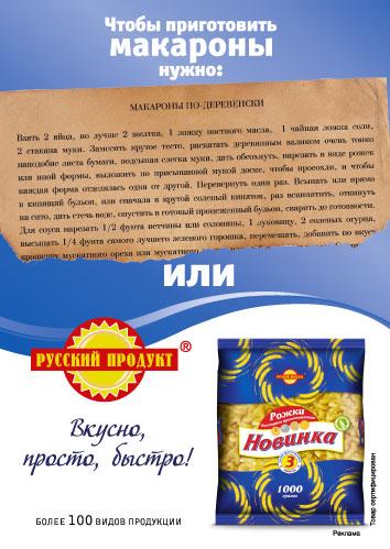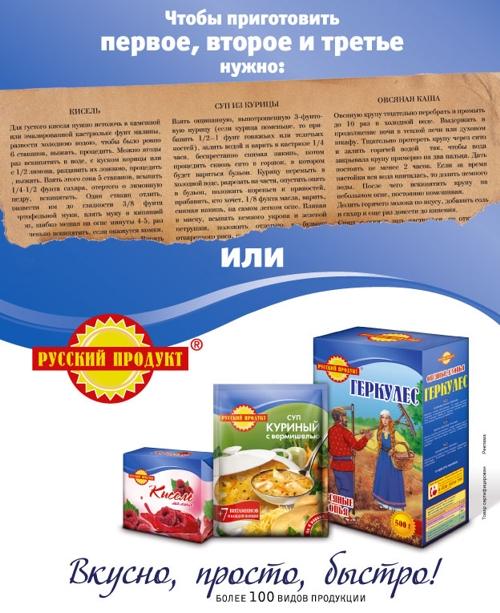 "Русский продукт" обновил свой логотип и начал второй этап рекламной кампанииВ конце 2005 года компанией "Русский продукт" было принято решение о создании единого бакалейного бренда "Русский Продукт", в которую вошли следующие товарные группы: супы, макароны, хлопья, специи, кисели, мучные п/ф, кремы, желе. В связи с этим, необходимо было решить задачу по созданию единого визуального представления продукции. Ранее дизайн упаковок всех этих товарных групп имел различные стилистические решения, даже графический элемент "синяя волна" был различен в разных товарных группах. При таком разнообразии визуального представления потребителям сложно было идентифицировать все эти продукты как относящиеся к одной торговой марке, что сильно затрудняло любые попытки продвижения марки. Разработка единой концепции упаковки была отдана в рекламное агентство "ACG-Media" в начале 2006 года. Задача агентства состояла в разработке единого графического стиля на основе "синей волны" и логотипа "Русский продукт". За основу были взяты 12 продуктов из разных товарных групп, входящих в бренд "Русский продукт". Основные требования к дизайну состояли в преемственности образов, с целью сохранения узнаваемости продукции, направленности на среднеценовой сегмент всех продуктов и в более современном дизайн-решении. Однако ни одна из 3х предложенных концепций так и не была выбрана. К работе активно подключились дизайнеры и бренд-менеджеры компании "Русский продукт". Параллельно с разработкой концепции единой бакалейной марки, было принято решение об обновлении логотипа компании, согласно тенденциям и требованиям рынка. В итоге была получена концепция, удовлетворяющая всем основным требованиям. Новый дизайн упаковки бакалейной продукции объединен основным графическим элементом - "синей волной", на которой расположен только логотип "Русский Продукт", что позволяет сделать на нем акцент, не отвлекая внимание потребителя на другие надписи. Организованное расположение всей информации о продукте на продуктовой зоне позволяет покупателю быстро "считывать" всю информацию о продукте. Согласно проведенным опросам потребителей, новая упаковка более красочная, яркая, сразу привлекает к себе внимание, и, при этом, не противоречит прежнему восприятию продукта. БЫЛО