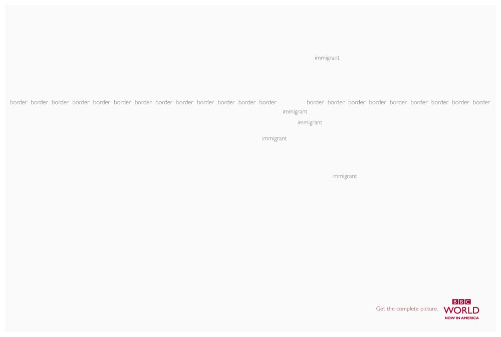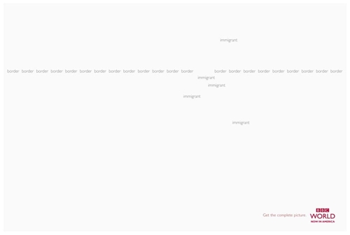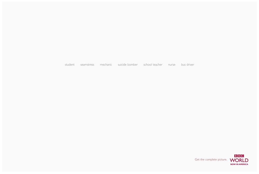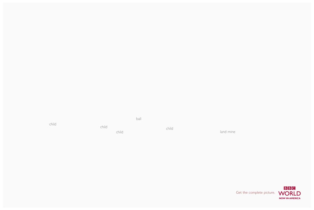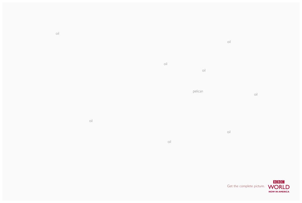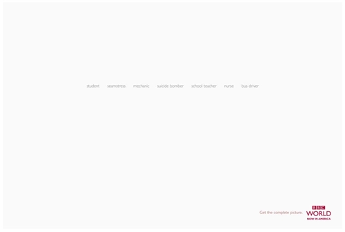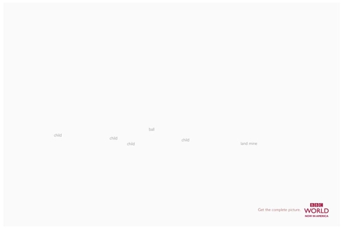 Реклама BBC World от агентства BBDOАгентство BBDO New York выпустило кампанию для BBC World под общим слоганом "Получи полную картину". На принтах с помощью слов изображены такие вещи, как переход иммигрантов через границу, игра детей с мячом около мины, пеликан, плавающий среди нефти, а также террорист-смертник рядом со студентом, швеей, механиком, школьным учителем, няней и водителем автобуса. Агентство: BBDO New York Главный творческий директор: David Lubars, Bill Bruce Исполнительный творческий директор: Eric Silver Творческий директор: Jerome Marucci, Ari Weiss Копирайтер: Steve McElligott Арт директор: Chuck Tso |