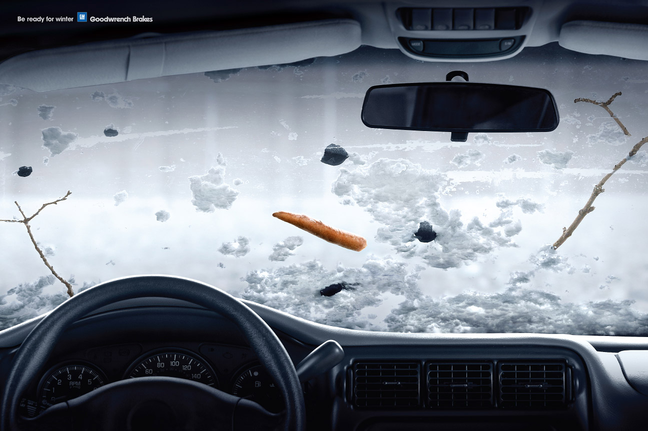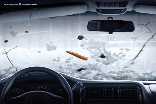 Реклама GM Goodwrench от агентства MacLaren McCannКанадский филиал агентства MacLaren McCann создал интересный рекламный плакат для тормозной жидкости Goodwrench от GM. На лобовом стекле автомобиля можно заметить такие части от снеговика как морковку, палочки и т.д. Надпись: "Будь готов к зиме. GM. Goodwrench тормоза". Агентство: MacLaren McCann, Calgary, Canada Творческий директор: Mike Meadus Арт директор: Brad Connell & Kelsey Horne Копирайтер: Kelsey Horne & Brad Connell Фотограф: Jason Stang |
