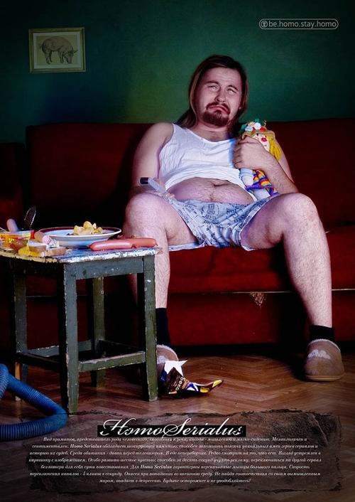 ![]() Homo Serialus Представитель рода человеческого, способный к речи, иногда — мышлению и мягко-сидению. Меланхоличен и сентиментален. У Homo Serialus хорошо развиты области мозга, обладает шокирующей памятью: способен запомнить до 1000 уникальных имен героев сериалов и историю их судеб. Среда обитания — диван перед телевизором. В еде непереборчив. Редко смотрит на то, что ест. Взгляд устремлен в картинку с изображением. Обладает стереоскопическим зрением. Особо развито шестое чувство: Homo Serialus способен за десять секунд учуять рекламу, переключиться на другой сериал без потери для себя сути повествования. Опасен при попадании во внешнюю среду. Не найдя соответствия со своим вымышленным миром, впадает в депрессию. Может быть агрессивен. Будьте осторожнее и не уподобляйтесь! ![]() Homo Bydlus Агрессивны, непредсказуемы, склонны, к насилию. Многогранны, как стакан. Питаются пивом и зазевавшимися интеллигентами. Умудряются коверкать даже матерный великорусский. Складывает буквы в слова, но сути не понимает: читает «Преступление и наказание» как уголовный кодекс. Homo bыdlus обитают «на районе». Пребывают в постоянном поиске ответов на вопросы: «старый, закурить есть?», «с какова раЁна?» и вечный вопрос «Шо?». Окружающих делят на три категории: Телки, Быки, и Чмо. Будьте бдительны и не уподобляйтесь! Макс Бурцев, |