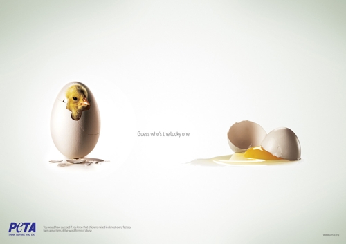 Реклама для организации по защите животных: кур жалко…Перед Вами принт, созданный для PETA, организации по защите животных. На этот раз она решила рассказать нам об издевательствах над курами. Слоган: "Догадайся, кто счастливчик. Вы будете удивлены, если узнаете, что куры, выращенные почти на всех фермах, являются жертвами худших форм жестокого обращения. PETA. Подумай, прежде чем есть" Арт директор: Hilder Romeo Копирайтер: Filipe Graza |