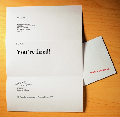 Реклама сериала "The Apprentice" от агентства Ogilvy & Mather: Вы уволены!Чтобы прорекламировать новый сезон сериала "The Apprentice" ("Новичок") перед офисными работниками - основной ЦА этого сериала - агентство Ogilvy & Mather раздобыло списки служащих множества компаний и разослало фальшивые письма об увольнении, которые были именными и доставлялись непосредственно каждому работнику. Надпись: "… Дорогая Кэнди, ты уволена!!!! Д. Трамп, мать всех боссов. P.S. Смотрите "The Apprentice" каждый четверг в 23:00 на канале 8TV." Агентство: Ogilvy & Mather, Malaysia Творческий директор: Daniel Comar Арт директор: Mag's Lim Копирайтер: Daniel Loo Фотограф: Alan Dang |