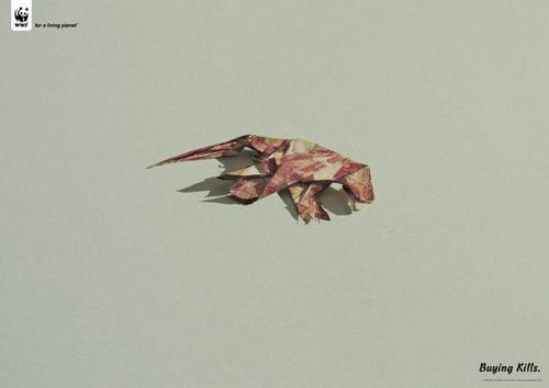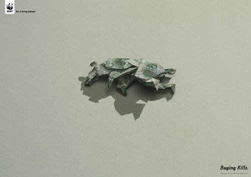 Очередная рекламная кампания WWFИ вновь WWF пытается спасти природу с помощью рекламы. На этот раз для создания принтов использовалась всемирно известная техника изготовления фигурок из бумаги Оригами, вот только они складывались не из простой бумаги, а из денег. Фигурки изображают различных животных лежа на боку, а надпись звучит "Покупки убивают". ![]() ![]() ![]() ![]() |