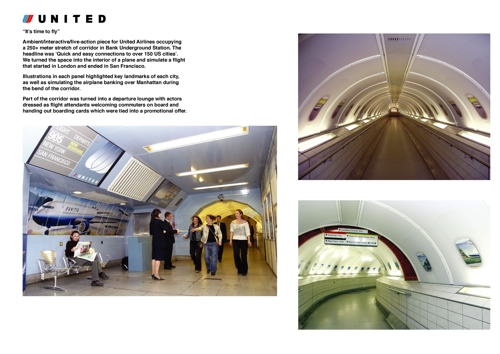 Рекламная кампания для авиакомпании United Airlines от агентства FallonАгентство Fallon разработало для авиакомпании United Airlines рекламную кампанию, которая проходила в лондонском метрополитене. Надпись: "Время для полета" Окружающее / Интерактивное / Действенное соединилось в одно целое для авиакомпании United Airlines, заняв пространство в более чем 250 метров в коридоре на станции метрополитена Банк (Bank Underground Station). Заголовком акции был следующий: "Быстрые и легкие связи с более 150 городами США". Мы предали этому месту интерьер самолета и смоделировали полет, который начался в Лондоне и закончился в Сан-Франциско. Иллюстрация на каждой панели выдвинула на первый план ключевые ориентиры каждого города, так же как и смоделированный вираж самолета в Манхэттене на протяжении изгиба коридора. Часть коридора была превращена в зал отлета с актерами, одетыми как стюарды, приглашающими жителей пригородной зоны на борт и раздающими посадочные талоны, которые были преподнесены в качестве рекламного предложения. Агентство: Fallon, LDN |