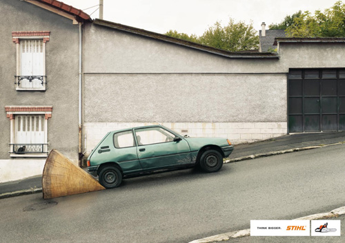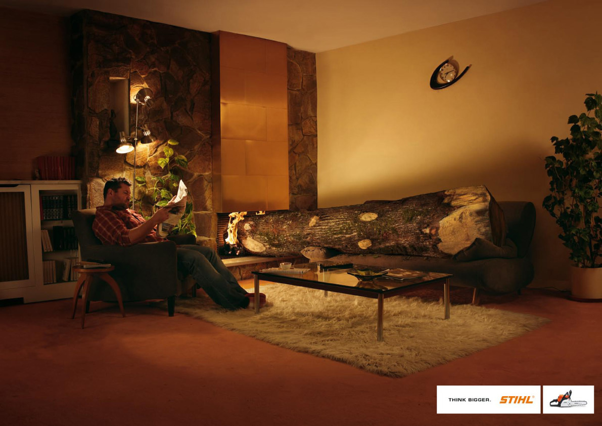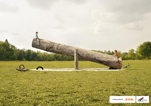 Большие вещи от Stihl и агентства Publicis ConseilАгентство Publicis Conseil разработало очередную рекламу для производителя садовой техники и пил Stihl. Слоган звучит как "Думай о большем", а на принтах изображены вещи, сделанные из дерева, которые в реальной жизни имеют намного меньший размер. Например, подставка под колеса автомобиля, детские качели или полено в камине. Агентство: Publicis Conseil, France Творческий директор: Olivier Altmann Арт директор: Charles Guillemant Копирайтер: Patrice Lucet Фотограф: Jean-Yves Lemoigne |