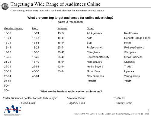 Проведенный для Американской рекламной федерации опрос 168 лидеров рекламной индустрии показывает, что они с оптимизмом воспринимают возможности, которые открывают новые медиа: бюджеты интернет-рекламы увеличатся в 2007 на 42% по сравнению с 2006 годом. Их доля вырастет с 16,3% до 23,2%. В частности, большинство руководителей считает, что к 2010 году существенная часть телевизионных рекламных бюджетов будет перенесена в онлайновое видео. Треть полагает, что эта доля составит 10-19%. Еще четверть считает, что в интернет уйдет около четверти бюджетов (20-29%). Лидеры индустрии используют различные возможности фокусирования онлайновой рекламы, но полагают, что поведенческий таргетинг работает лучше всего. Большинство – 71% опрошенных – полагают, что онлайновая среда лучше всего работает на прямой отклик клиентов, хотя и не все аудитории можно достичь таким образом.
