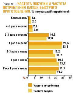 Частота потребления лапши быстрого приготовления практически совпадает с частотой ее покупки. Таким образом, можно говорить о том, что лапша быстрого приготовления приобретается для собственного потребления (рис. 1).