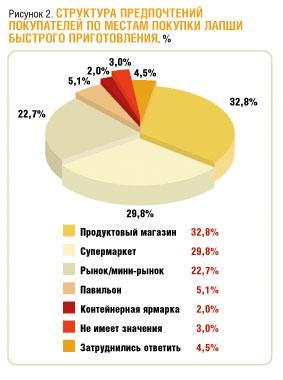 Анализируя полученные в ходе опроса потребителей данные, можно сделать вывод, что омский рынок лапши быстрого приготовления в настоящее время возглавляют три компании: ТД «Роллтон» (Москва) с продукцией под торговыми марками «Роллтон» и Big Bon, корейская фирма Korea Yakult Co., Ltd. (ТМ «Доширак» и «Квисти») и ЗАО «Масан Рус Трейдинг» (Москва, ТМ «Биг-ланч» и «Бизнес-ланч»).