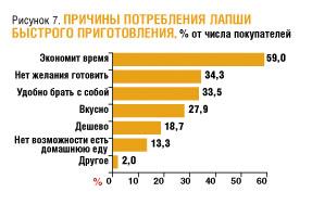 В целом в отношении причин потребления лапши быстрого приготовления голоса омичей распределились следующим образом: основная часть респондентов – 59% – едят «быструю» лапшу, потому что это экономит время, 34,3% – в связи с тем, что нет желания готовить, 33,5% – потому, что ее удобно брать с собой, 27,9% – считают ее вкусной, 18,7% - отдают должное ее низкой ценой, а 13,3% едят лапшу быстрого приготовления, когда не имеют возможности потреблять пищу домашнего приготовления (рис. 7).