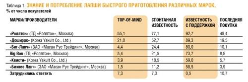При этом явным лидером продаж является лапша быстрого приготовления ТМ «Роллтон», которую при последней покупке приобрели почти 50% опрошенных (табл. 1).