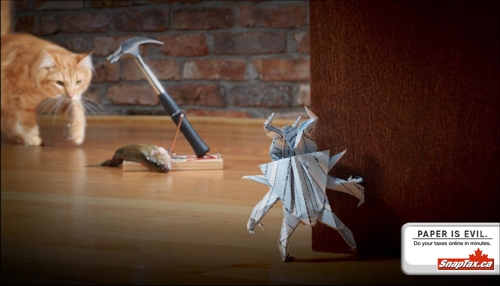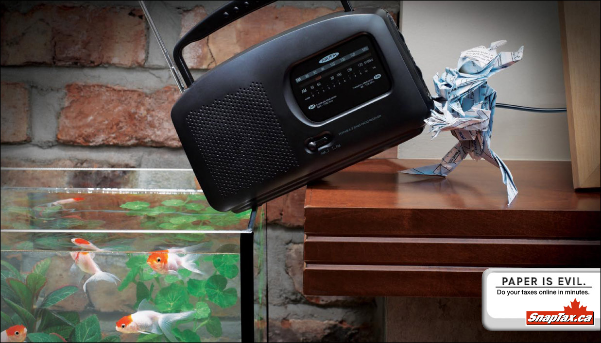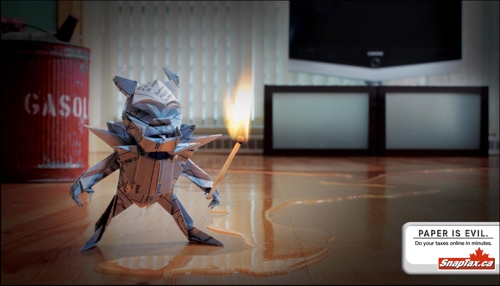 Агентство DDB разработало рекламу для on-line оплаты налогов SnapTax.caКанадское агентство DDB выдвинуло идею для рекламы on-line оплаты налогов SnapTax.ca. Данная работа - забавна и хорошо выполненной. Основная суть в том, что лучше потратить несколько минут и оплатить налоги on-line. Надпись: "Бумага - зло. Заплати налоги on-line за несколько минут". Агентство: DDB, Vancouver, Canada Творческий директор: Alan Russell, Bruce Sinclair Арт директор: Dan Strasser Копирайтер: Kevin Rathgeber Фотограф: Alastair Bird |