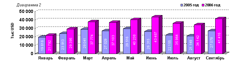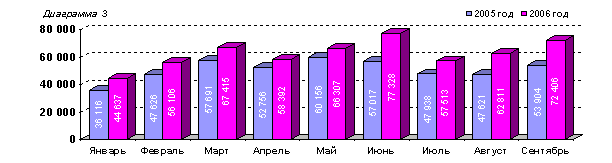 Диаграмма 3. Динамика изменений количества выходов рекламных роликов по месяцам за период январь - сентябрь 2005, 2006 гг.