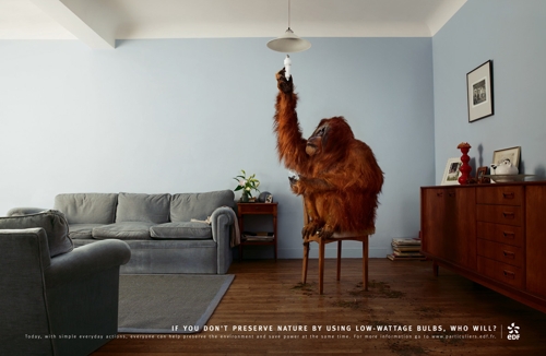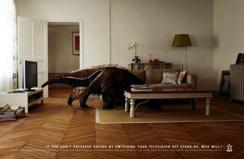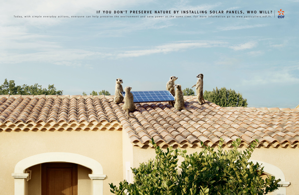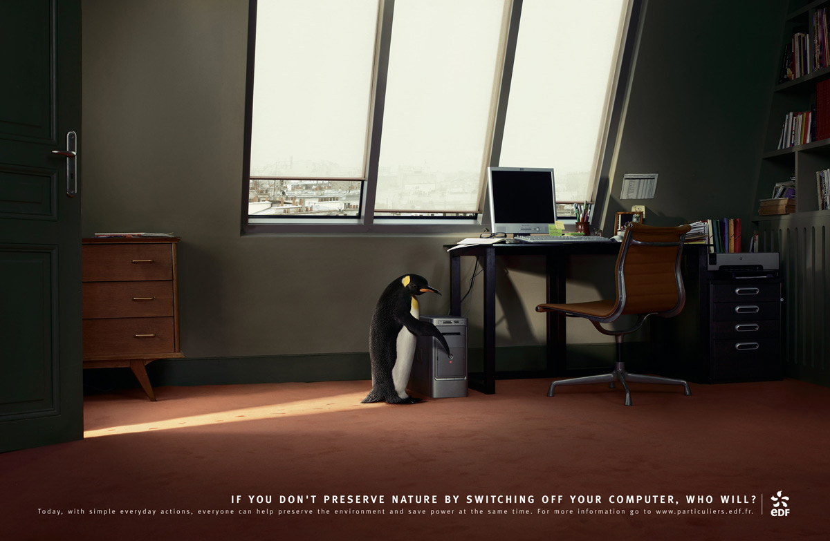 Экономим энергию вместе с агентством Publicis Conseil и компанией EDFАгентство Publicis Conseil разработало для французской компании-производителя энергии EDF рекламную кампанию, состоящую из нескольких принтов. На них животные показывают нам, как можно экономить электроэнергию, выключая электроприборы, используя экономичные лампы или установив солнечную батарею на крышу. Надпись: "Если вы не будете беречь природу, выключая свой компьютер, то кто будет?" "Если вы не будете беречь природу, используя лампочки с малым потреблением мощности , то кто будет?" "Если вы не будете беречь природу, устанавливая солнечную батарею, то кто будет?" "Если вы не будете беречь природу, выключая свой телевизор, то кто будет?" "Сегодня, выполняя каждый день простые действия, каждый может одновременно помочь сберечь окружающую среду и сэкономить энергию." Агентство: Publicis Conseil, Paris, France Творческий директор: Olivier Altmann Арт директор: Frederic Royer Копирайтер: Olivier Camensuli Фотограф: Jean-Yves Lemoigne |
