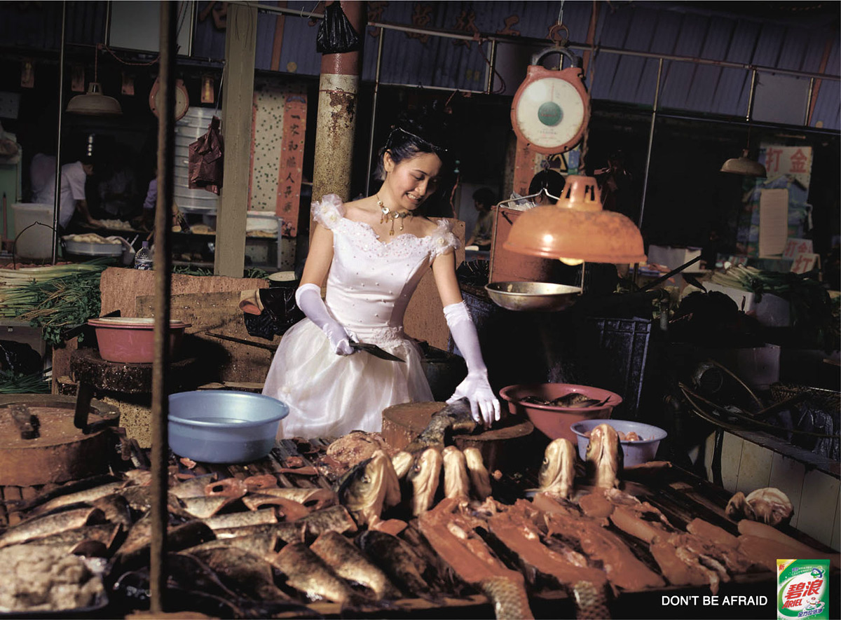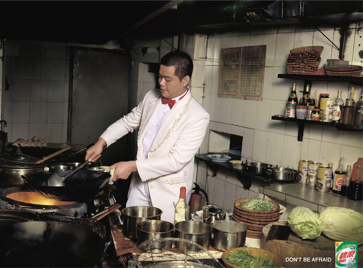 Рекламная кампания от агентства Saatchi & Saatchi China для Ariel: Не бойся!Как часто нам из страха запачкать светлую одежду приходится переодеваться? А китайское агентство Saatchi & Saatchi считает, что если у вас есть такой порошок как Ariel, то бояться вам нечего. И вы запросто можете чинить машину, готовить или торговать на рынке даже в белой одежде. Надпись: "Не бойся. Ariel" Агентство: Saatchi & Saatchi, Guangzhou, Китай Творческий директор: Pollyc Chu Арт директор: Darren Cheung Копирайтер: Mao liu Фотограф: David Chen |