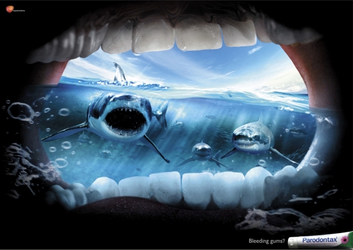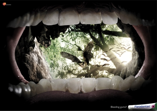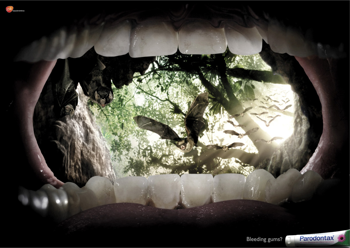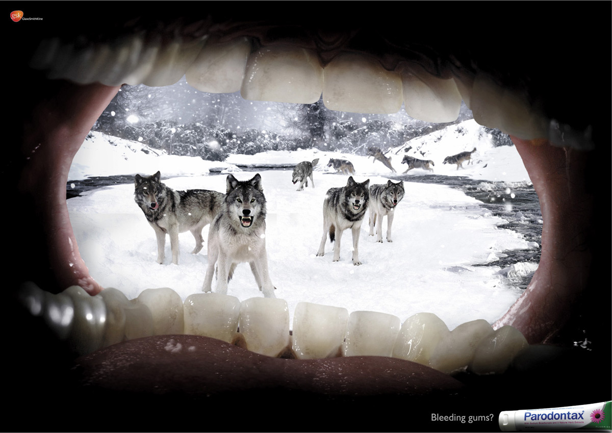 К хищникам только с крепкими деснами. Реклама пасты Paradontax, созданная агентством Grey Global GroupВсем известно, что хищные животные чуют кровь на расстоянии. Так что сингапурское агентство Grey Global Group не советует вам купаться среди акул, гулять в джунглях, где водятся летучие мыши-кровососы, или находится рядом со стаей волков, пока вы не вылечите ваши десны с помощью зубной пасты Paradontax от компании GlaxoSmithKline. Надпись: "Кровоточат десны? Paradontax"