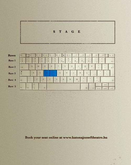 Реклама от агентства Leo Burnett Budapest для театра Katona JozsefРекламный постер предназначен для рекламы резервирования билетов в режиме online в театре Katona Jozsef Theatre в Будапеште. Расположение мест в зале театра выполнено в виде клавиатуры. Надпись на постере призывает: "Зарезервируйте места online на сайте katonajozseftheatre.hu" ![]() Творческая группа: Рекламное агентство: Leo Burnett, Budapest |