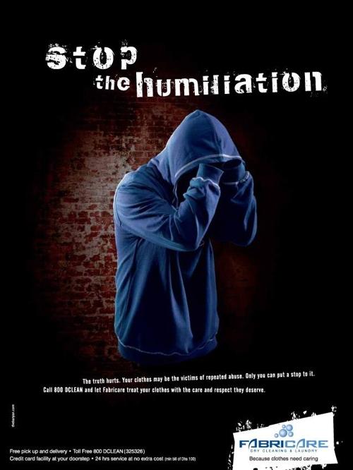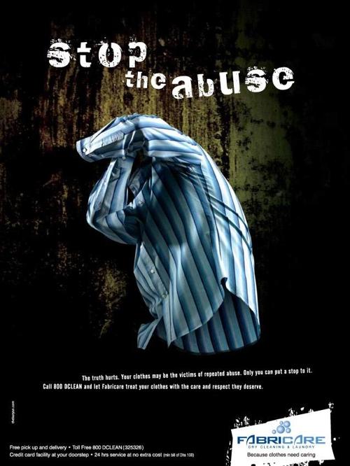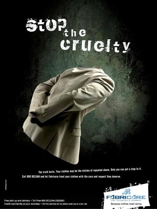 Рекламная акция прачечной-химчистки FabricAre: "Остановите насилие!"Надпись на рекламных плакатах химчистки гласит: прекратите насилие, зверство, а также унижение в отношениии вашей одежды. Далее на плакате идет информация с телефонами прачечной-химчистки FabricAre , где "к одежде относятся бережно и с уважением". ![]() ![]() ![]() |