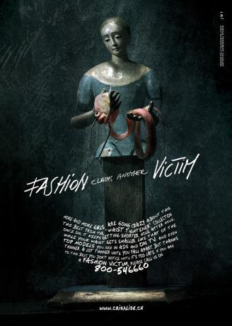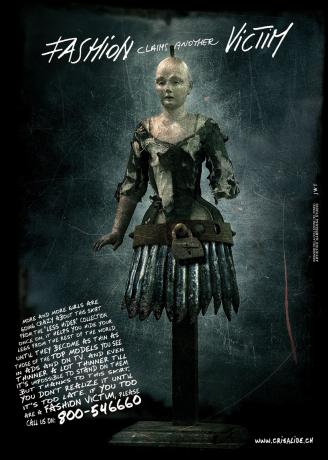 Жертвы модыПредставления о «правильном» и «красивом» ежедневно транслируются в человеческое сознание через рекламу, показы мод, телешоу… Чешский «Форум Crisalide» - организация, озабоченная тем, как медийный мир желаний и предпочтений убивает людей. К сожалению, они не всегда могут донести свои опасения до широкой публики. Агентство JWT и арт-директор Фабио Анзани (Fabio Anzani) совместно с итало-шведской ассоциацией по борьбе с булимией и анорексией создали для форума серию постеров, в форме довольно жёсткой иронии рассказывающих о том, как медийное продвижение моды влияет на рассудок и здоровье молодых девушек. «Множество девушек по всему миру сходит с ума от этого пояса, который помогает уменьшить талию. И ваш вес становится меньше, как у тех моделей, что можно увидеть в рекламе. И даже ещё меньше, намногоменьше, пока вы не развалитесь на части. Но скажите спасибо этому поясу: вы не заметите, как это произойдёт. Если вы тоже жертва моды, позвоните по этому телефону». «Эта шляпка становится всё более популярна по всему миру. Потому что она поможет вам сравнить себя с моделями, которых можно увидеть в рекламе и понять, что вы слишком толстая, а вам надо стать тоньше, намного тоньше. Эта шляпка не даст вам ничего понять, пока не станет слишком поздно. Если вы тоже жертва моды, позвоните по этому телефону». «Всё больше и больше девушек по всему миру сходят с ума от этой юбки. Потому что она поможет вам прятать ваши ноги от всего мира, пока они не станут такими же тонкими, как у моделей, которых можно увидеть в рекламе. И даже тоньше, намного тоньше, пока на них уже будет невозможно стоять. Вы не поймёте, пока не будет слишком поздно. Если вы тоже жертва моды, позвоните по этому телефону». KAK.RU |