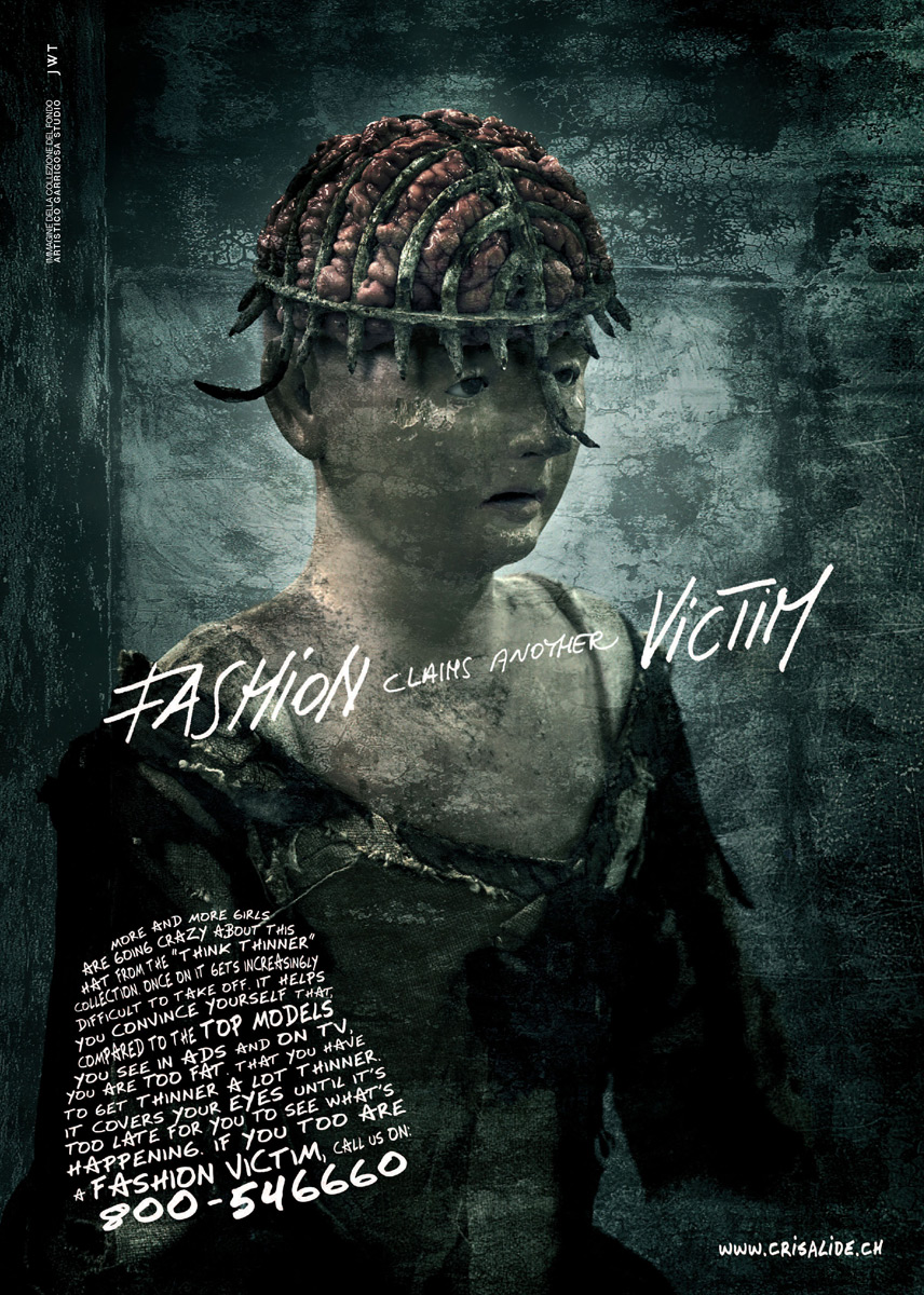 Жертвы модыПредставления о «правильном» и «красивом» ежедневно транслируются в человеческое сознание через рекламу, показы мод, телешоу… Чешский «Форум Crisalide» - организация, озабоченная тем, как медийный мир желаний и предпочтений убивает людей. К сожалению, они не всегда могут донести свои опасения до широкой публики. Агентство JWT и арт-директор Фабио Анзани (Fabio Anzani) совместно с итало-шведской ассоциацией по борьбе с булимией и анорексией создали для форума серию постеров, в форме довольно жёсткой иронии рассказывающих о том, как медийное продвижение моды влияет на рассудок и здоровье молодых девушек. «Множество девушек по всему миру сходит с ума от этого пояса, который помогает уменьшить талию. И ваш вес становится меньше, как у тех моделей, что можно увидеть в рекламе. И даже ещё меньше, намногоменьше, пока вы не развалитесь на части. Но скажите спасибо этому поясу: вы не заметите, как это произойдёт. Если вы тоже жертва моды, позвоните по этому телефону». «Эта шляпка становится всё более популярна по всему миру. Потому что она поможет вам сравнить себя с моделями, которых можно увидеть в рекламе и понять, что вы слишком толстая, а вам надо стать тоньше, намного тоньше. Эта шляпка не даст вам ничего понять, пока не станет слишком поздно. Если вы тоже жертва моды, позвоните по этому телефону». «Всё больше и больше девушек по всему миру сходят с ума от этой юбки. Потому что она поможет вам прятать ваши ноги от всего мира, пока они не станут такими же тонкими, как у моделей, которых можно увидеть в рекламе. И даже тоньше, намного тоньше, пока на них уже будет невозможно стоять. Вы не поймёте, пока не будет слишком поздно. Если вы тоже жертва моды, позвоните по этому телефону». KAK.RU |