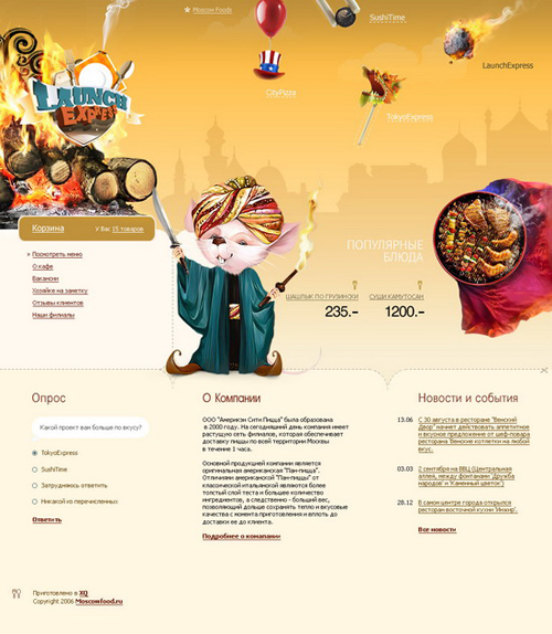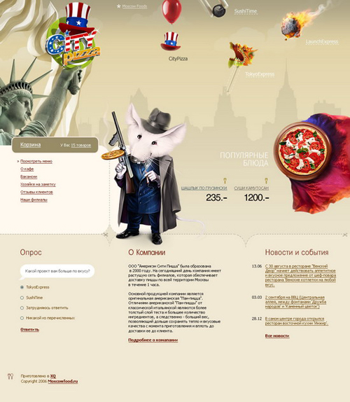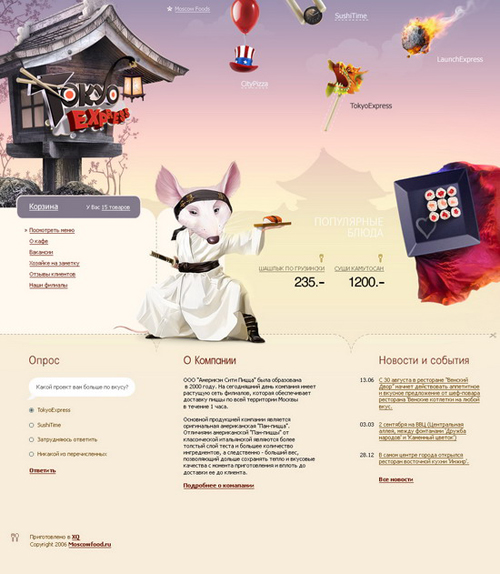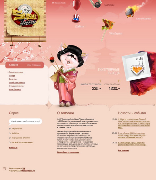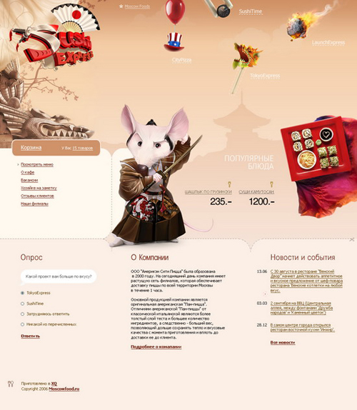 Новый имидж группы компаний Moscow FoodОдна из крупнейших в Москве группа компаний по экспресс доставке еды Moscow Food состоит из четырех тематических брендов, где представлены наиболее популярные на сегодняшний день кухни - японская, китайская, американская пицца и горячие блюда, приготовленные на открытом огне. В студии XQ завершилась разработка сайтов для каждого из четырех направлений - City Pizza, Sushi Time, Tokyo Express и Lunch Express. Также XQ разработали сайт для отдельного тематического сервиса Sushi Express. Все сайты оформлены в стилистике представляемой кухни, но вместе с тем, есть характерные объединяющие элементы, свидетельствующие об их принадлежности к одной компании. Кроме того, в XQ создавался головной сайт Moscow Food, на котором находится информация обо всех четырех брендах, и с которого легко попасть на любой из них. ![]() ![]() ![]() ![]() ![]() ![]() |