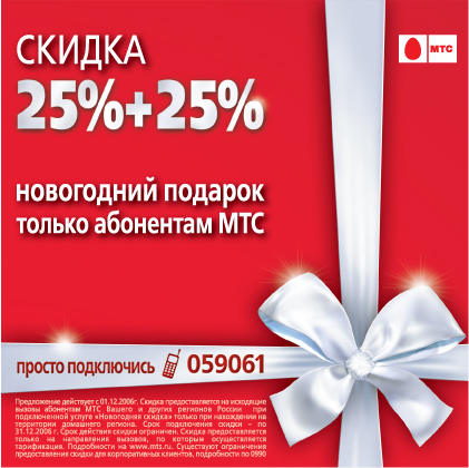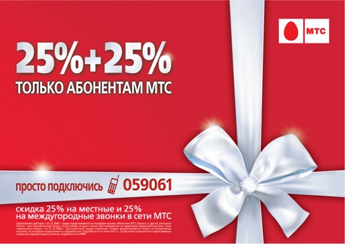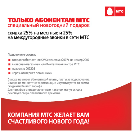 МТС начинает кампанию, приуроченную к новогодней рекламной акции1 декабря МТС ввело новую услугу - "Новогодняя скидка": все абоненты МТС смогут подключить специальную услугу и получить новогоднюю скидку 25% на звонки абонентам МТС всех регионов России. Рекламная кампания "Новогодней скидки" пройдет на телевидении, радио , в прессе и в наружной рекламе. Креативная концепция и производство видеоролика принадлежит Baumann Ber Rivnay Saatchi & Saatchi (Израиль). Длительность ролика 30 секунд. Показ ролика начался 1 декабря на всех федеральных каналах (Первый, Россия, НТВ и других). Над креативной концепцией и производством радиоролика также работало Baumann Ber Rivnay Saatchi & Saatchi (Израиль). Ролик длительностью 30 секунд с 1 декабря транслируется на федеральных радиостанциях. ![]() ![]() ![]() ![]() ![]() |