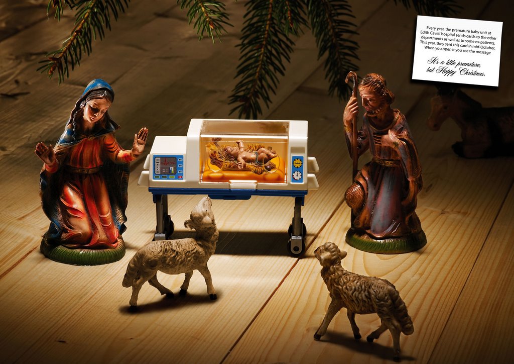 Преждевременное поздравление от госпиталя Edith Cavell, созданное агентством McCann-Erickson BelgiumПеред Вами не совсем обычная рождественская открытка, созданная агентством McCann-Erickson для госпиталя Edith Cavell. Надпись: "Каждый год отделение недоношенных детей в госпитале Edith Cavell рассылает открытки другим подразделениям, так же как и некоторым бывшим пациентам. В этом году они прислали эту открытку в середине октября. Когда вы откроете ее, вы увидите послание: Немного рано, но с Рождеством". Агентство: McCann-Erickson, Belgium |