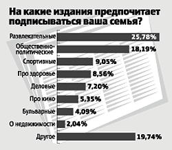 «Новые Известия» совместно с национальной почтовой службой Mail.ru провели опрос об изданиях, на которые предпочитают подписываться россияне. Участвовали в опросе 1028 человек. Как выяснилось, самыми популярными у подписчиков сегодня являются развлекательные издания. На них подписан каждый четвертый участник нашего опроса (25,8%). На общественно-политические подписывается каждый пятый (18,2%), и это один из сюрпризов опроса, который проводился среди Интернет-аудитории. Довольно высокий процент пользователей Интернета, которые подписываются на серьезные бумажные СМИ, – явление более чем интересное и показательное.