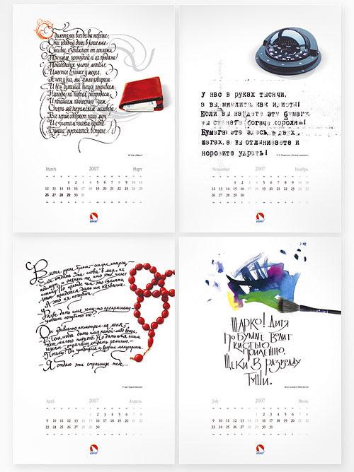 На страницах календаря «Берега» можно прочитать и строчки японской поэзии, и поэзии Возрождения, и отрывки из произведений русских и зарубежных писателей. «На каждой странице календаря разместились цитаты, выражающие определенную мысль или эмоцию, которая не только несет некий общечеловеческий смысл и не зависит от времени, но еще и говорит о бумаге, реализацией которой уже много лет занимается компания «Берег», - рассказал Илья Леонтьев, арт-директор РА Skygraphics.