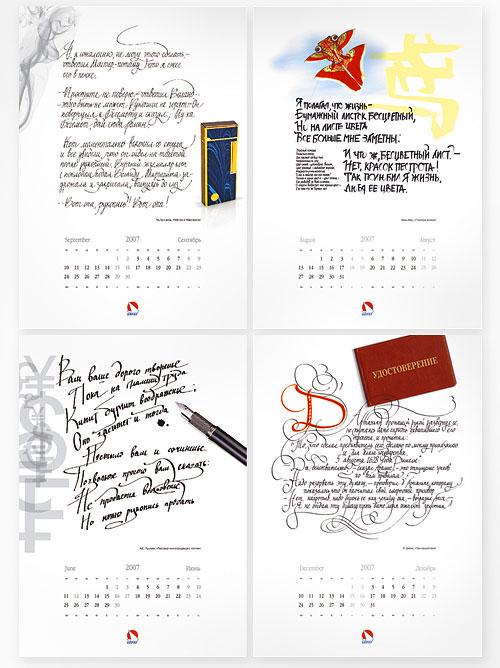 Каждый фрагмент текста оформлен в определенном стиле. «В каллиграфии мы пытались отразить дух эпохи автора, раскрыть смысл цитаты. Было очень важно найти индивидуальный образ каждой страницы, ведь именно типографическое решение задает эмоциональный тон календаря. Не менее важный этап - подбор предметов для иллюстрации, мы старались находить остроумные решения для каждого случая и не отходить от смысла самой цитаты при подборе иллюстрации» - добавляет Ольга Безручко, дизайнер, отвечающий за проект. Например, к цитате из Петрарки в рекламном агентстве в качестве иллюстрации подобрали логотип журнала «Forbs» и ленточку победителя с красноречивой надписью «First Place». Знаменитое булгаковское «Рукописи не горят!» из «Мастера и Маргариты» «дополнил» серебряный дым и современная итальянская зажигалка с рисунком дыма на корпусе.