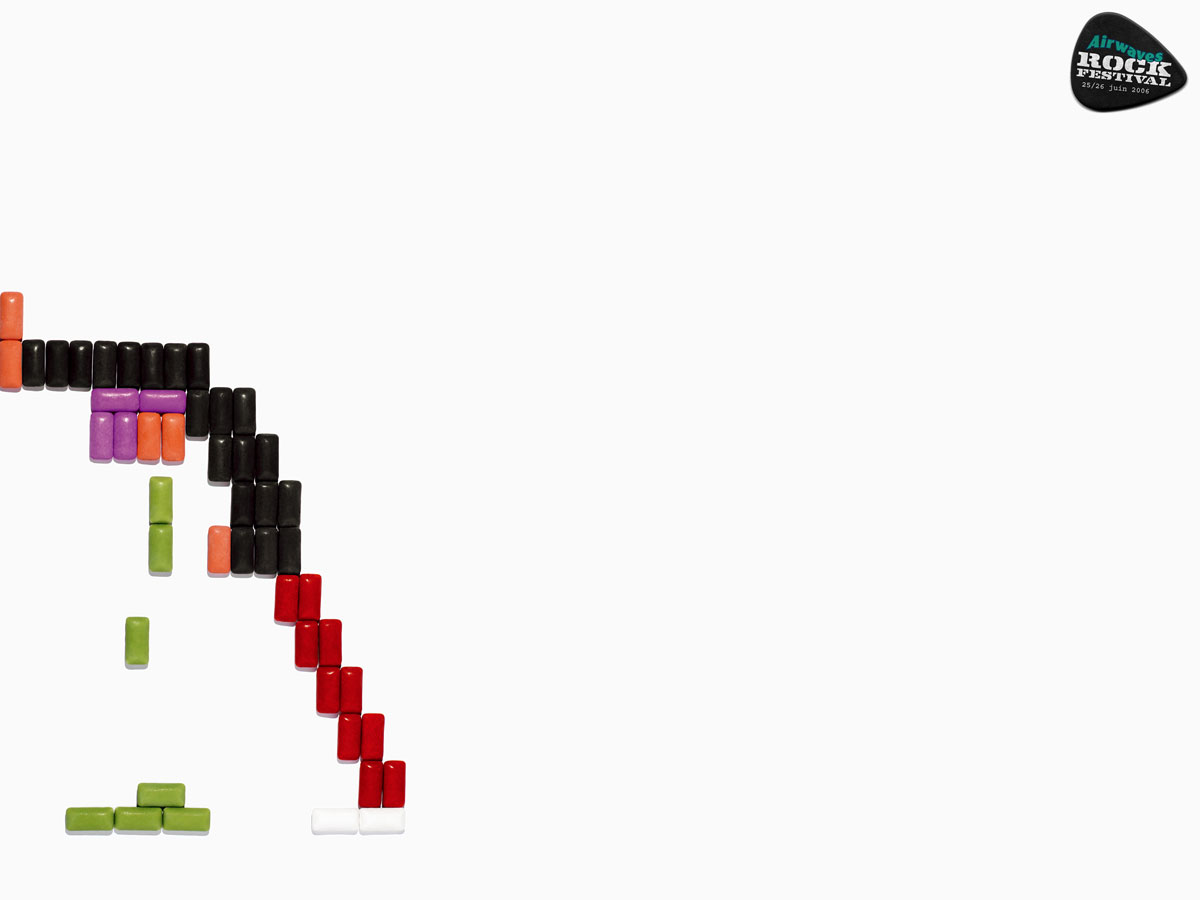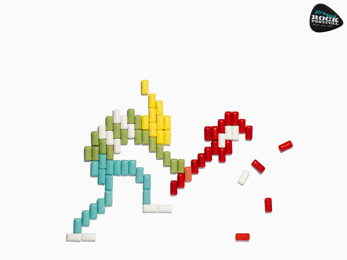 Реклама из жвачки. CLM/BBDO Paris воплотили суть спонсора в кампании рок-фестиваля Airwaves Rock FestivalСреди многих производителей алкоголя вошло в привычку устраивать музыкальные фестивали, чего не скажешь о производителях жевательной резинки. Однако пред вами реклама рок-фестиваля Airwaves Rock Festival, спонсором которого стала жевательная резинка Airwaves. Специального для этого события агентство CLM/BBDO разработало серию рекламных постеров, которые ассоциируются с роком. Их особенностью является то, что все картинки выложены из цветных подушечек жвачки. Агентство: CLM/BBDO, Paris, France Творческий директор: Gilles Fichteberg, Jean Francois Sacco Копирайтер: Olivier Dermaux, Laurent Laporte Арт директор: Mathieu Vinciguerra, Sophian Bouadjera Фотограф: Semi Fredo |